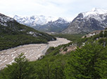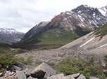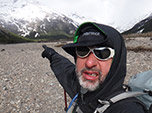 O caminho em torno do Lago Jeinimeni é feito em veículo 4x4 e bem marcado, mas chegando ao final do lago o mato repleto de espinhos, típico de algumas regiões da Patagônia, e charcos sem fim tomaram conta do terreno. Decidi desistir de encontrar a trilha e cortar o mato em diagonal e me dirigir diretamente para a margem pedregosa do Estero la Gloria, uma rio de degelo em um vale desproporcionalmente largo. Juro que tentei não molhar as botas e os pés, mas logo percebi a inutilidade do intento. Eram tantos riachos, córregos, lamaçais e charcos para cruzar que eu caminharia mais tempo com as botas nas mãos do que nos pés - nada muito aconselhável quando a temperatura está em torno de 5° C e o vento assobia nos ouvidos.