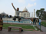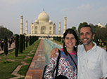 Este incrível monumento é uma declaração de amor póstuma feita pelo imperador islâmico Shah-Jahan a sua terceira esposa, hinduísta, Mumtaz Mahal. Trata-se de um conjunto de construções no estilo persa e mughal, tendo como centro o imenso mausoléu de mármore branco construído em 1653, chamado Taj Mahal. Logo após a conclusão do Taj, Shah Jahan foi deposto por seu filho Aurangzeb e colocado sob prisão domiciliar no grandioso Forte de Agra, o qual também visitamos. Embora não estivesse em seus planos e projeto arquitetônico inicial, após a sua morte, Shah Jahan foi sepultado no mausoléu ao lado de sua esposa amada, cujo túmulo se tornou o único aspecto assimétrico daquela construção colossal. Sentamos em alguns dos bancos do jardim, hipnotizados pelo Taj, observando ele gradualmente se tornar dourado na medida em que o sol ia se pondo majestosamente.
