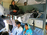 Nossa estatura é mediana, mas excessiva para aqueles acentos. Sentamo-nos de lado para caber nossas pernas naquele cubículo, sendo que meus joelhos e pés ficaram no corredor, tomando pancadas e pisadas a todo tempo. Foram dezenas de paradas no caminho para ingresso de mais pessoas. Quando parecia inimaginável que qualquer alfinete entrasse no ônibus, subiam mais 6 pessoas e assim seguia. Elas ficavam agarradas na porta, metade do lado de fora. Isto se repetiu inúmeras vezes, a ponto das pessoas ficarem esmagadas entre si e debruçadas sobre aqueles que estavam sentados. Por mais absurdo que pareça, se não houvesse grade nas janelas, talvez alguém cairia para fora. Eu fiquei sem sentir as pernas da metade para o fim da viagem. Tentamos acolher as crianças, evitando que fossem espremidas ou quem sabe pisoteadas. No início, elas ficavam ressabiadas em sentar no colo daquelas pessoas tão diferentes, mas logo relaxavam, sob olhar atento e agradecido da mãe. Mal saia uma criança do meu colo, logo apareceria outra para ser amparada.