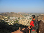 Jaipur é uma cidade grande, com mais de 3,5 milhões de habitantes e de clima semi-árido, marcando o início do deserto do Rajastão, uma região fascinante. A cidade foi originalmente construída dentro de muralhas e planejada de acordo com a arquitetura védica indiana, visando o conforto e a prosperidade de seus cidadãos. Ela também é economicamente famosa pela exportação de ouro, diamante e jóias. Percebemos a existência de uma forte indústria artesanal, onde a maior parte dos turistas se deliciam em compras. Todos tentavam nos arrastar para o famoso bairro de artesanato, mas nossas pesadas mochilas nos impedem de adquirir qualquer item novo, pelo contrário, gradualmente estamos nos desfazendo de alguns itens com vistas a chegar em nossa meta, reduzir 35% da nossa bagagem.