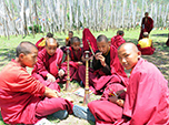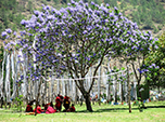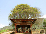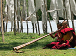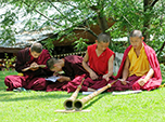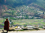 Nossa primeira parada em Punakha foi num monastério dedicado à fertilidade, chamado Chimi Lhakhang. Pessoas do mundo inteiro visitam este local para fazerem pedidos e retornam para agradecer pela graça recebida. Foi muito mágico nossa chegada a este local. Caminhamos entre campos de arroz e subimos uma ladeira de flores amarelas, até chegarmos a uma enorme figueira. Esta árvore foi plantada ali a partir de um ramo da figueira indiana sob a qual Buda atingiu a iluminação. Ficamos sentados debaixo daquela sombra gostosa quando ouvimos o som de um instrumento musical. O som vinha do jardim do monastério, onde dezenas de monges estavam tendo aula de música para entoar a longa corneta tibetana. Uma imagem bucólica e memorável, grupos de jovens monges, vestidos com suas típicas batas bordô, sentados num preguiçoso gramado verde, estudando partituras e soprando longas cornetas. Tentamos nos aproximar e interagir com os tímidos monges, mas fomos desistimulados pelo nosso guia.