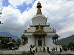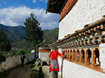 Aguardavam-nos no aeroporto, o guia e o motorista que nos acompanhariam pelos próximos dias. Como a diária é salgada, tínhamos pouco dias no Butão e pretendíamos desfrutar ao máximo. Seguimos imediatamente para capital butanesa, Thimpu. Visitamos um templo e uma enorme estupa budista. O local estava repleto de pessoas andando em sentido horário ao redor da estupa. Em uma mão os andarilhos seguram seu japamala (uma espécie de terço budista) e do outro o mani korlo (uma roda de oração, dentro da qual há orações). As pessoas caminham sussurrando mantras a cada “conta” (total de 108) do japamala e, ao mesmo tempo, viram o mani korlo em sentido horário. Tudo muito diferente e curioso para nós. Já tínhamos entrado em contato com o budismo no Sri Lanka (Theradava), mas aqui é o tibetano (Vajrayana), com costumes e rituais diferentes.