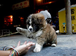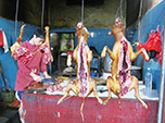 Tivemos bons momentos em Yangshuo. Descemos o rio Li de jangada, alugamos bicicletas, visitamos cavernas, águas termais, banho de lama, subimos montanha e muito mais. Nesta adorável cidade também visitamos o mercado municipal local, onde havia uma variedade imensa de legumes, vegetais, frutas e animais, vivos e abatidos. Porém, o que realmente nos deixou chocado foi encontrar cachorros e gatos expostos para consumo, especialmente, alguns cães abatidos e pendurados. Tentei desviar a atenção da Karina para ela não ver aquela cena, chamando-a para minha direção, mas distraída como é, quase esbarrou nos animais pendurados. Imediatamente, decidimos deixar o mercado e pegar fôlego do lado de fora. Levou algum tempo para nos recompormos daquela cena chocante.