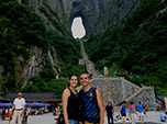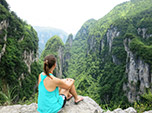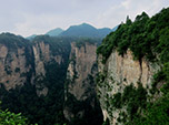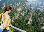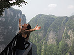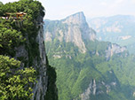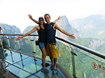 Um passeio, em dois estágios, por si maravilhoso e inesquecível. Do alto víamos uma estrada sinuosa, lembrando a lendária Estrada do Rio do Rastro em Santa Catarina. Fomos direto para o último estágio, deixando a visita da enorme “pedra furada” (Tianmen Cave) para o final. Quando se chega ao topo da montanha se tem a impressão de que não é possível ver a base de tão alto. Como a maior parte da montanha é de pedra de cartze, forma-se uma paredão reto sem fim. Logo iniciamos o trekking pelas passarelas suspensas ao redor da montanha. Parte destas lindas passarelas são de vidro, dando um frio na barriga. Tem-se a sensação de que se está suspenso no ar, num abismo. Todos se divertiam com gritos se propagando no ar, formando longos ecos. Muitas árvores crescem na horizontal nas fendas de imensos paredões verticais. Alguns pontos há cavernas, cada uma com uma história a ser contada. Nunca vimos nada parecido!