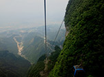 Seguindo a recomendação de algumas chinesas que conhecemos na viagem, fomos conhecer Zhangjiajie. Nunca havíamos ouvido falar deste lugar e os guias de viagem famosos não lhe davam qualquer destaque. Elas nos disseram que as “montanhas flutuantes” mostradas no filme Avatar foram inspiradas nas montanhas de um parque daquela região. Fomos conferir e definitivamente não nos arrependermos. Nossa primeira parada nesta região foi na Tianmen Mountain, cujo acesso se faz por meio de um imenso teleférico, o mais longo em montanha do mundo. Este teleférico percorre 7.455 metros e ascende 1.279 metros em altitude.