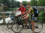 Shanghai é um bom ponto de apoio para conhecer várias cidades interessantes na região. Todas as cidades são conectadas por trem e alguns com trem bala. Foi lá que pela primeira vez viajamos num trem que ultrapassa a velocidade de 300 km/h! Shanghai é rodeada de cidades interessantes. Vale muito a pena pegar o trem cedo, parar numa cidadezinha histórica, alugar uma bicicleta e rodar o dia todo. Foi o que fizemos na cidade de Suzhou, chamada de “Veneza chinesa”. Na base da mímica e risadas, alugamos duas bikes, estilo “barraforte” antigas e enferrujadas, de um senhor mais velho ainda, o qual interrompeu sua roda de gamão para sorridentemente nos atender. Mesmo com guidão torto e a outra quase sem freio, rodamos horas pela cidade, parando nos canais, templos e demais atrações da cidade. Houve um momento em que paramos numa praça, atraídos por uma música típica. No centro da praça havia um grupo enorme de idosos dançando músicas lentas. Uma verdadeira “balada” da terceira idade à luz do dia. Nós nos divertíamos observando eles e fomos convidados a entrar na dança. Até arriscamos uns passinhos para diversão daqueles velhinhos em boa forma.