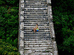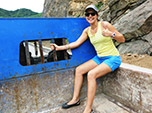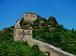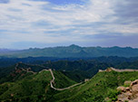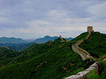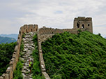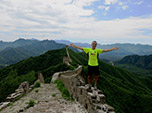 Há muitos pontos para se visitar a muralha. Seguindo os sábios conselhos do amigo Marcinho, optamos por um setor mais distante e longe da horda de turistas. Fomos com um ônibus local para Jinshanling. Foi uma grande aventura! O ônibus nos deixou na rodovia principal após quase três horas de viagem e passamos a caminhar por uma estrada secundária deserta. Cansados de caminhar, conseguimos uma carona na caçamba de um caminhão (os chineses são muito solícitos). Assim iniciamos nossa caminhada num setor onde pretendíamos caminhar até outra mais conhecida e de lá retornar de ônibus, conforme experiência do nosso amigo. Porém, chegando lá descobrimos que aquela opção estava fechada há dois anos. Assim subimos a muralha e caminhamos sob ela por algumas horas sem destino certo. Abstraímos as incertezas e mergulhamos naquele cenário idílico. Construções que atingem sete metros e meio de altura e sete de largura, subindo e descendo montanhas verdejantes, como uma calda de um gigante dragão chinês. Ficamos um bom tempo ali, abraçados, em silêncio, deleitando-se daquela paisagem inesquecível, num chamego romântico.