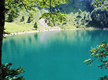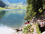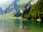Não há nada mais gostoso num trekking do que encontrar um rio, cachoeira ou lago para se refrescar e varrer o suor do corpo. Nossa trilha nas proximidades de Saint Gallen margeava um lindo lago cristalino. Hesitamos um pouco em mergulhar naquelas águas geladas. Bastou o primeiro se aventurar para que todos nós nos jogássemos como crianças felizes. Um banho de lago com amigos é sempre nostálgico, nos remete a um estado de felicidade infantil. Nós não éramos os únicos, boa parte das pessoas fazia o mesmo. Ficamos observando uma família com quatro filhos pequenos se despindo, mergulhando e se divertindo no lago.