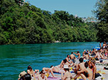 Outro ponto disputado na cidade é a região do lago Leman. Além de jardins, parques, barracas itinerantes, marinas e restaurantes, há espaços públicos para as pessoas curtirem um mergulho no lago, com sanitários, decks flutuantes, pequenas praias e até trampolim. Novamente havia uma infinidade de pessoas e gêneros, inclusive alguns seres engraçados para nossos olhos conservadores. Nós ficamos fascinados com a ideia de descer o rio, sem saber ao certo onde iríamos parar.