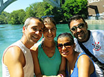 Embora Anna e Fabrício já estivessem morando lá há quase dois anos, ainda não haviam experimentado descer o rio. Outro dia, sem a menor ideia de onde iríamos parar, simplesmente pulamos no caudaloso rio e nos deixamos levar, cada um abraçado numa bóia. Enquanto descíamos o rio, num bate papo animado, observávamos em sua margem pessoas, construções e paisagens. Já se afastando da região urbana, passamos por debaixo de uma grande ponte onde dois rios se cruzaram. O encontro com o rio de degelo fez a temperatura da água despencar. Tomamos um susto. Não suportaríamos aquela temperatura por muito tempo e decidimos “encostar”. Deixamos a água e caminhamos de volta para nosso ponto de origem, cruzando com mais pessoas fazendo piquenique e até alguns “campings”.