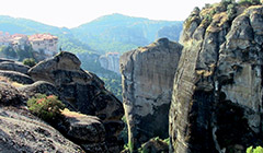 Conheci alguns estrangeiros no hostel e fomos juntos para Meteora. Não canso de enfatizar, mesmo quem viaja sozinho, no estilo mochilão, nunca está solitário. Neste ambiente é fácil fazer amigos e encontrar parceiros para explorar os locais turísticos. Decidimos fazer a visita por conta própria, ou seja, percorrer circuito entre um monastério e outro a pé. Embora cansativa, esta opção, além de econômica, foi recompensadora pelas paisagens e vistas únicas. Os monastérios são pequenos, mas muito bem cuidados, repletos de pinturas, flores e relíquias religiosas, sem falar das vistas exuberantes. No interior dos monastérios aproveitei para me sentar num cantinho isolado onde eu pude mergulhar em meditação e oração, direcionando, por meio de pensamentos e visualizações, toda aquela paz e espiritualidade para minha família, especialmente para o Palla (pai da Karina).