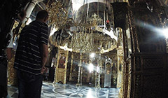 Acordei às 2h30m para me preparar para a próxima cerimônia. Atordoado de sono, reparei que meu colega russo já estava acordado rezando no escuro, sentado na beira da cama. Baseado na minha experiência da cerimônia matutina, eu imaginei que a missa duraria uma hora e assim eu poderia voltar para cama. Ocorre que a cerimônia começou às 3 horas e só foi terminar às 9 horas! Sim, foram seis horas acompanhando os rituais litúrgicos! Confesso que foi muito difícil e que boa parte acabei dormindo sentado, por mais que eu tentasse me concentrar. Suscintamente, a liturgia se resume na leitura das escrituras sagradas pelos monges, sem uso de instrumentos musicais. Eles leem em coro, com diferentes entonações, criando um som musical forte e mágico. Os monges e peregrinos também costumam beijar as imagens sagradas e as relíquias. Embora não soubesse o que eram aquelas relíquias, cuidadosamente guardadas em caixas rebuscadas, também segui o ritual do beijo.