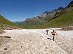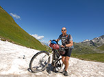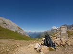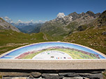 Logo adiante, já deixando a floresta para trás atravessei uma camada de neve, lembranças do último inverno e depois de mais uma hora de caminhada finalmente cheguei ao Col du Bonhomme a 2329m de altitude, onde ventava muito e apesar do sol forte foi preciso colocar um fleece ou mesmo um corta-vento resolveria. A paisagem é deslumbrante e um mirante apontava o nome de todas as montanhas no horizonte.