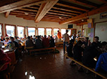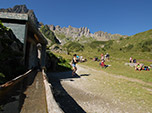 Ainda restava mais 1h de trilha montanha acima para chegar ao Croix du Bonhomme, um lindo refúgio que foi construído inicialmente em 1920 e em 1991 foi reformado e hoje tem 150 leitos, além da área de camping. O jantar foi servido as 19h30 e não existe cardápio, a nossa sorte em uma boa comida fica por conta da boa vontade do cozinheiro. Primeiro foi servido um caldo de legumes com fatias de pão e depois chegou polenta com carne de panela, a minha mesa recebeu este prato com aplausos, pois todos eram italianos. Bebemos vinho e água. Ainda fomos servidos com uma rodada de pedaços de queijos da região e finalizando com fatias de bolo de nozes. Realmente um ótimo dia de trekking nos Alpes. |