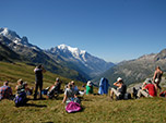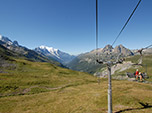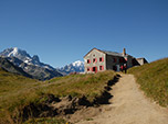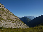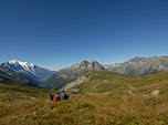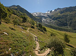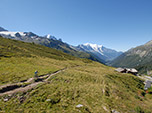 Depois de duas horas de caminhada encontrei um filete de água descendo pela montanha e pude matar a sede, algum tempo depois comi a maçã e logo cheguei no Col de Balme com uma bela vista do maciço do Mont Blanc e no vale as cidades de Le Tour, Argentiére e Chamonix.