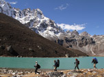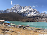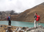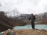 Começamos a descida ao glaciar e aos pouco a trilha nos leva para um caminho relativamente tranquilo e após uma hora chegamos ao final do glaciar e após enfrentar a dura subida chegamos em um mirante de onde avista pela primeira vez o vilarejo de Gokyo e o lago Dudh Pokhari, conhecido como o terceiro lago. A paisagem é muito bonita com as montanhas nevadas ao fundo e o Gokyo Ri com 5.360 metros, de onde pode avistar o Everest e boa parte da cordilheira do Himalaia. Mas, infelizmente não teríamos tempo de subir ao cume, pois perdemos alguns dias quando a Ju, Edi e Dani passaram mal. Poderíamos até tentar subir, mas depois teríamos de que descer no mesmo dia para Dhole, o que daria no total 9 horas de caminhada e seria muito puxado. Resolvemos que apenas dormiríamos em Gokyo e no outro dia já partiríamos para Dhole.