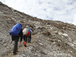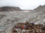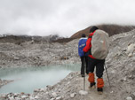 Saímos de Thangnak logo cedo e após uma hora de caminhada encontramos os nossos porteadores sentados descansando, ao passar por eles entendi porque resolveram parar tão cedo. A nossa frente estava o imenso glaciar Ngozumpa que teriamos que atravessar para chegar em Gokyo, a 5.040 metros de altitude. Este é o maior glaciar do Nepal com aproximadamente 20 km de extensão e neste trecho teríamos que atravessar aproximadamente 1km de sua largura. Olhando de cima, parecia impossível atravessar, por baixo fica o glaciar, a camada de gelo, e por cima dele é uma imensidão de pedra sobre pedra.