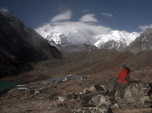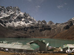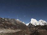 Como não iria subir Gokyo Ri, aproveitei a noite que estava estrelada e saí para fotografar. Saí as 21h e no início o Carlos Santalena me acompanhou nas fotos, mas as 22h ele resolveu ir para o Lodge e fiquei sozinho. Fiz algumas fotos a beira do lago e depois resolvi subir ao mirante, onde estivemos pela tarde. As vezes o Cho Oyu aparecia entre as nuvens e pude fotografá-lo. Usei a longa exposição e fiz fotos interessantes. A meia-noite, com temperatura de - 1 º C, resolvi também ir dormir, pois o outro dia também seria longo. |