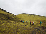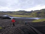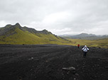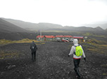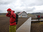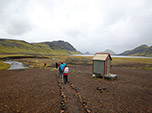 Aqui na Islândia as trilhas são muito bem demarcadas com um postinho de madeira com a ponta pintada indicando a trilha a ser seguida. E assim nós três fomos seguindo, depois de uns 50 minutos de caminhada escutei os russos gritando a minha frente, e logo avistei as cabanas.