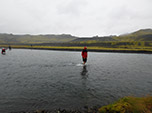 Paramos a beira do rio e nesse momento já começava a chover, e desta vez eu não tinha opção, o rio era bem largo, o jeito foi tirar as botas e colocar a sapatilha de borracha e atravessar. A água gelada chega a doer os pés e todos atravessam o rio gritando ou de dor ou pelo choque térmico. Do outro lado o mesmo procedimento de sempre, enxugar os pés e tentar tirar os pedriscos para que durante a caminhada eles não machuquem o pé.
