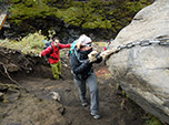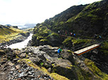 Em um trecho de descida utilizamos uma corda para ajudar na segurança e depois por uma bela ponte de madeira atravessamos um rio de desgelo com um glaciar ao fundo.