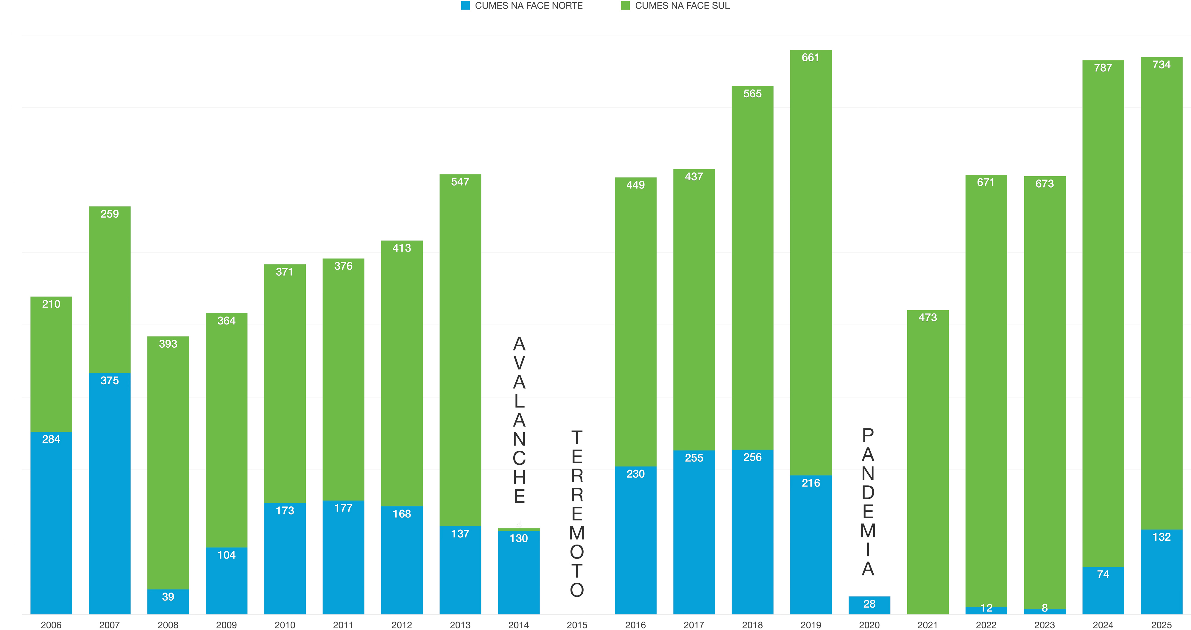 Este gráfico mostra a evolução do número de cumes no Everest pelas rotas da Face Sul, no Nepal, e da Face Norte, no Tibet, ao longo dos últimos 20 anos. A diferença é evidente: a Face Sul concentra a maior parte das ascensões, impulsionada por uma logística mais estruturada, maior oferta de expedições comerciais e temporadas com janelas climáticas e políticas mais estáveis. Já a Face Norte, historicamente mais técnica e sujeita a restrições políticas e operacionais, apresenta números menores e oscilações mais acentuadas. Eventos extraordinários, como avalanches, o terremoto de 2015 e a pandemia, provocam quedas abruptas nas estatísticas, lembrando que, no Everest (8.848 m), nada é totalmente previsível.