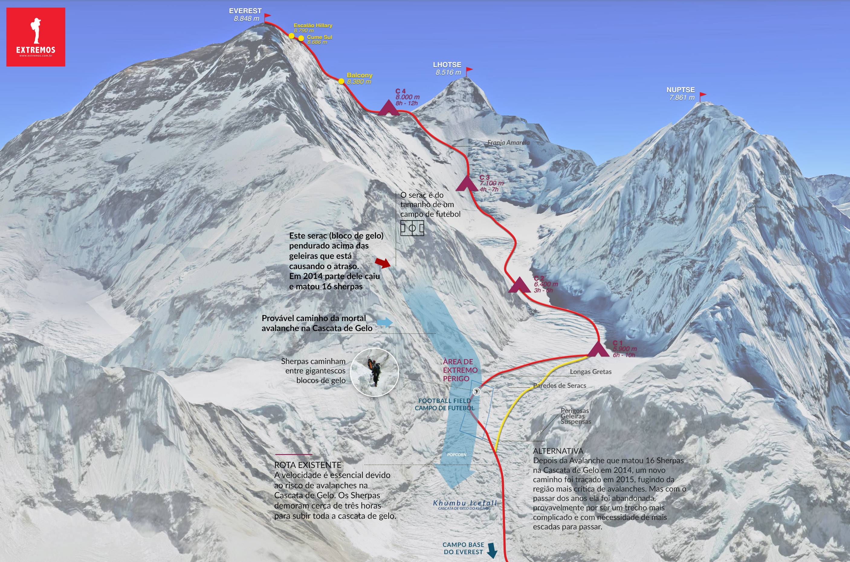 Esse tipo de análise você só encontra aqui no Extremos. O infográfico que criei mostra com clareza o ponto central do atraso em 2026: um grande serac instável, suspenso acima da rota tradicional da Cascata de Gelo do Khumbu, exatamente na região mais crítica da progressão. Esse bloco de gelo, com dimensões comparáveis a um campo de futebol, está posicionado acima do corredor por onde passam os sherpas durante a fixação das cordas. É o mesmo serac que, em 2014, colapsou parcialmente e causou a morte de 16 sherpas, o que naturalmente aumenta o nível de cautela neste trecho.