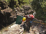 Tínhamos um kit de resgate para corredeiras com uma corda estática de 25 metros, algumas fitas de escalada para ancoragens, mosquetões e cabos de resgate aquático. Nos dividimos, uns desceram a margem oposta até o poço da cachoeira para receber as canoas enquanto os outros, eu inclusive, montavam todo o sistema de segurança do rapel. Organizamos a ancoragem com a corda numa árvore, isso nos deu espaço para trabalharmos na beira da parede vertical, clipamos um mosquetão e com um nó amarramos o cabo de resgate por onde desceríamos os equipamentos. Pronto, o sistema estava montado, agora era preciso testá-lo. Mas qual canoa seria a primeira? A cobaia? Os donos das embarcações se olharam e quando menos percebemos tudo já estava lá embaixo, uma canoa por vez seguida dos equipamentos que ela transportava. Os tripulantes, por segurança, desceram a pé pela margem. Foi tudo muito rápido e divertido!