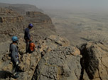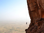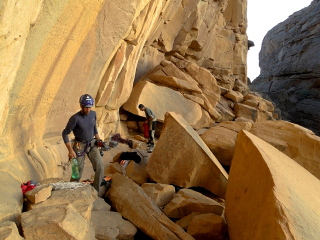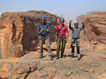 Amanheceu o terceiro dia de escalada. Por sorte, pela manhã, a parede ficava na sombra. Apressamo-nos em subir pelos 200 metros de cordas fixas. O Eliseu não estava bem ainda da vista e decidiu descer até a aldeia e providenciar mais água para nosso ataque final ao Éléphant. Eu e o “Capitão” (Fernando) tínhamos a missão de esticar todas as cordas, ou seja, escalar até não ter mais cordas para fixar. Escalei alguns metros acima do que havia conquistado no dia anterior e cheguei a uma encruzilhada: para a direita uma fenda negativa e bem esquisita e para a esquerda um diedro estranho que levava a um buraco, um tipo de gruta que acessava o outro lado da Tromba do Elefante. Segui minha intuição e fui direto ao “olho do elefante” e passei para o outro lado da torre. Foi incrível, pois o buraco dava acesso a um platô gigantesco, no lado oposto ao que havíamos começado a escalada. Fizemos um varal com a corda restante e ainda iniciamos a abertura de mais um esticão. Neste ponto acabaram-se as cordas e rapelamos tudo. Chegando ao chão encontramos o Eliseu bem melhor. Havia descansado e lavado os olhos com um colírio e estava pilhado para subir com tudo e dormir no platô naquele mesmo dia! Eu e o Capitão nos olhamos e pensamos “jumarear tudo de novo!!!”. Mas, fazer o que não é, era para isso que estávamos ali. Deixamos a preguiça de lado e começamos a arrumar a tralha toda para rebocar até o Platô da Ventania. Água, muita água, era só isso que pensávamos enquanto acomodávamos a carga dentro dos haulbags. O Eliseu estava com o diabo no corpo neste dia e assumiu o reboque com muita vontade. No final daquele dia estaríamos instalados no platozão e jantamos uma comida fria, pois o fogareiro não estava funcionando com o combustível maliense. Por sorte a comida liofilizada fica razoável até fria. O duro seria tomar café da manhã sem café! Daquela plataforma, a 250 metros de altura, nos confins da África, conseguíamos mandar mensagens de celular para o Brasil. Maldita tecnologia- desta maneira a gente não consegue se desconectar.
