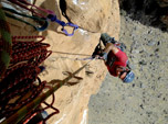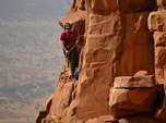 Cumeeeeeeeeee!!!! Guiei o último esticão de corda que tinha uns pitons soltos e uma chapa (proteção fixa na rocha) ao lado de uma fissura perfeita. Ancorei a corda numa pedra do topo e gritei avisando meus companheiros que a corda estava fixa. Consegui uma sombra em meio aos blocos para me esconder do sol enquanto eles subiam. O calor estava de matar. O cume da montanha era plano e o visual era incrível. Havia outras montanhas próximas e dava para enxergar muito longe aquela paisagem de savana com as tribos em volta, além de aglomerados de árvores aqui e ali. Onde havia água o verde florescia vigoroso. Fotos, filmagens, uns goles de água quente, um pouco de cocô de corvo para o chefe da tribo e iniciamos os malditos rapéis. Digo malditos porque logo no segundo lance de rapel a corda enroscou e não conseguíamos puxar, de maneira que tive de subir de prussik (tipo de nó blocante que usamos para subir por uma corda usando dois cordeletes). Subi uns 20 metros, consegui desenroscar e recuperei a corda, passei meu estribo numa ponte de pedra e rapelei nele, enquanto meus companheiros eram cozidos pelo sol. Acho que quando a gente fica parado é pior, sente mais calor.
