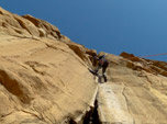 O quarto dia de escalada foi o dia D. De torrar no sol! Como agora estávamos do outro lado da montanha seríamos assados. E eu esquecera meu guarda-sol na base. Enquanto o Eliseu guiava a cordada delicada e difícil acima de nosso acampamento avançado, eu o Capitão torrávamos no sol. E nada daquele vento que nos açoitara a noite toda e quase não nos deixou dormir! Seguíamos uma bela fissura que mirava o cume. Um pouco antes de chegar ao topo do Éléphant nossa via “bateu” na Via Francesa, que, por sinal era cheia de chapeletas ao lado das fissuras. Acho que eles também não confiaram nas fissuras, porém foram um pouco mais drásticos (para não dizer antiéticos) em relação à segurança.