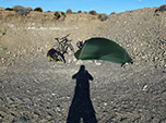 Pedalei 40 quilômetros bastante concentrado, até às 19:30, quando senti que não dava mais. Tinha percorrido míseros 56 quilômetros o dia todo, desde às 9:00 em ponto. Estava moído. Vi um trailer estacionado ao lado de um trator e pedi permissão aos funcionários de manutenção da estrada para acampar junto deles. Tudo OK, mas eles partiriam para outro acampamento 10 km adiante. Fiquei escondido do vento forte, que soprou o dia todo nas minhas costas, atrás do barranco cavado por tratores. Por companhia apenas uma pequena raposa que circundava minha barraca.