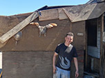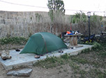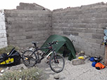Pedalei mais de 40 quilômetros morrendo de medo a cada pedra, buraco, valeta que encontrava no caminho. Cheguei ao asfalto da Ruta 40 aliviado. O vento a favor era fortíssimo e consegui manter média de 32 km/h por duas horas. Num posto de trabalho do órgão que faz manutenção nas estradas, em Tamel Aike, um argentino muito gentil e prestativo - Don Roberto Angel Alfaro, me ajudou a remendar o trailer com barras de ferro de construção e arame. Parei para acampar nas ruínas de uma casa abandonada à margem do Rio Chico, onde o asfalto da Ruta 40 termina e bifurca em direção a Gobernador Gregores.
