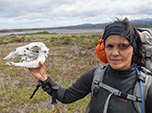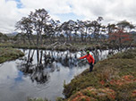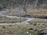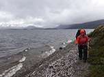 No quinto dia dessa pequena expedição, Adriana e eu fomos margeando o Lago Windhond por toda sua extensão leste, até chegar a uma pequena baía, justamente o ponto em que a margem do lago vira para oeste e fica paralelo ao oceano da Baía Windhond, ao sul. Nesse ponto procuramos e encontramos uma abertura nos bosques que nos levou, passando entre duas lagoas, até um rio. A idéia era cruzar esse rio e seguir em linha reta, caminhando ao lado de outras lagoas, até a praia. Mas o rio estava muito cheio, arriscado demais para cruzar pela água… E não havia outra opção de seguir rumo sul.
