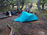 Foram mais de dez horas e mais de 23 quilômetros praticamente ininterruptos de trekking selvagem, sem trilha, até chegar ao fim do vale do tal rio que seguimos, a menos de dois quilômetros do furioso mar austral, encontro de Atlântico e Pacífico. Montamos acampamento debaixo de uma árvore meio seca, meio morta, ao lado de uma curva de rio, semi-protegidos do vento por uma colina a oeste e uma crista de morro mais distante a leste. Montamos acampamentos cansados e um pouco irritados, sem perceber a extrema beleza do lugar. Havíamos escolhido instintivamente talvez o melhor lugar para acampar num raio de vinte quilômetros… Uma beleza que descongelaria nossos corações na manhã seguinte.