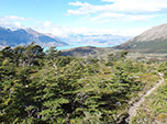 Partindo do posto de fronteira argentino, o caminho é uma trilha em singletrack para cavalos, que ciclistas teimosos como eu insistem em fazer com suas bikes. São 6,4 quilômetros de empurra-bike, sendo os primeiros dois quilômetros morro acima e bem íngremes. Em vários momentos eu tinha que agarrar a bike com uma mão e o bike trailer com a outra e levantá-los juntos, morro acima, um metro (e um gemido) por vez. Mas, o bosque à minha volta era tão bonito e a vista para a Laguna del Desierto e as montanhas do vale do Río de las Vueltas tão espetacular, que o suor que me escorria do rosto e banhava minha roupa passavam quase despercebidos.