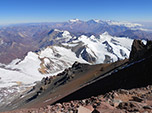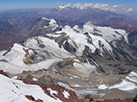 Novamente o grupo se dividiu e fiquei atrás acompanhando o casal que seguia lentamente pela trilha. Neste trecho senti que a mulher não estava desfrutando de sua viagem e resolvi comentar ao Manoel, pois acreditava que o trecho que viria entre confluência e Plaza de Mulas seriam muito duros para ela. Sabendo que ficaria por lá só uma noite antes de voltar pelo mesmo caminho. Nos Juntamos ao grupo com um pouco de atraso e juntos observamos os glaciares da parede sul. A descida foi muito mais fácil e em 2h já estávamos em confluência.