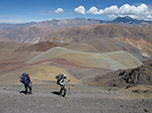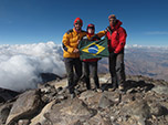 Do cume percebemos claramente que o tempo continua muito instável do lado argentino, vimos o Mercedário, que acabamos de escalar, e outras inúmeras montanhas completamente nevadas, algo raro para esta região dos Andes na época em que nos encontramos. Temos amigos que agora estão escalando o Aconcágua e eles devem estar enfrentando muitas dificuldades com este tempo ruim.