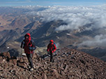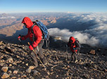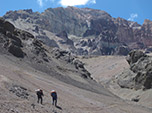 Nossa caminhonete Andina nos deixou há 3.900 metros, acampamento-base do Las Tórtolas. Após uma noite tranquila, começamos nossa aproximação rumo ao acampamento alto, na verdade um pequeno e confortável refúgio de montanha chamado Gabriela Mistral, situado há 5.200 metros de altitude, de onde fizemos nosso ataque ao cume.