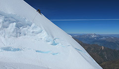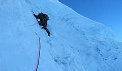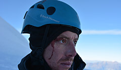 Apesar de a lua ter se posto e a escuridão nos envolvido completamente, Nathan seguiu o seu instinto e foi escalando rapidamente em direção ao cume, buscando outro caminho cerca de cem metros abaixo do alto da aresta, até chegarmos a um paredão vertical de gelo que nossas lanternas não permitiam observar o seu final. O gelo duro como pedra fez nosso ritmo diminuir, mas Nathan foi avançando, enquanto a inclinação se aproximava dos 90o. E então um grito, senti a corda esticar, equipamentos despencarem abaixo. Um pedaço de gelo havia se desprendido e meu amigo havia caído cerca de 8m. Nathan estava no escuro, havia perdido a sua lanterna, mas conseguiu se aproximar a um dos grampos onde logo nos reunimos. Sangue corria acima do seu olho direito, também havia machucado um dos braços e torcido o tornozelo esquerdo. O susto foi passando, e eu já pensando em descer, mas Nathan queria continuar.