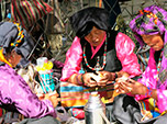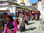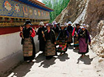 Poucos homens ainda se vestem com roupas tradicionais, ou seja, casaco longo forrado com lã de carneiro, geralmente preto, com mangas grossas dobradas, mostrando um forro colorido, botas vermelhas de lã, calças compridas, chapéu e um cordão amarrado na cintura. Enquanto caminham ao redor dos templos, homens e mulheres carregam um japamala (uma espécie de terço budista) na mão esquerda e um mani korlo (instrumento rotatório, dentro do qual há orações) na mão direita.