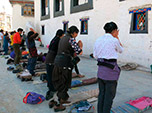A devoção tibetana é algo que nunca vimos antes. Uma entrega sincera e tocante. O ritual de prostração é surpreendente. Prostrar-se é ato de intensa humildade, autoconhecimento e prática das crenças budistas. Para executar as prostrações, o devoto se coloca de pé, coloca as mãos em forma de oração na altura do coração. Enquanto recita mantras em voz baixa, desloca as mãos para o topo da cabeça, desce para frente da garganta e finaliza no peito novamente. Então desce ao chão, deitando-se totalmente de bruços, com as mãos esticadas à frente, tocando a testa no chão. Em seguida, o devoto se levanta, dá um novo passo e repete o mesmo ato centenas e centenas de vezes. Este ritual se desenrola por horas ao redor de algum espaço sagrado, o que pode significar algumas dezenas de metros ou extenuantes quilômetros.