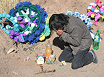 Durante a noite e a manhã do outro dia, participamos das cerimônias do Dia de los Mortos na casa da família do falecido Francisco Cruz. Em sua homenagem, uma enorme quantidade de oferendas era depositava em frente ao seu retrato na sala da casa onde morava. Pães, vinhos, folhas de coca, cigarros, doces. Muita comida e oração. Na manhã seguinte um cortejo até o cemitério no alto da montanha, oferendas a Pachamama pelo caminho e um delicioso assado de lhama.