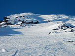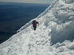 Em função dos fortes ventos e baixas temperaturas as formações de gelo estavam simplesmente incríveis, assumindo as mais variadas formas possíveis e ganhando vida com o brilho intenso sol e o azul do céu. Tomei uma certa distância de meu amigo e pude avistar o Luis que já se encontrava no cume, caminhei por mais uns vinte minutos chegando a uma crista onde esperei pelo Pollo. Logo após sua chegada combinamos que esperaríamos o Jorge e a Beatriz para colocá-lo a nossa frente nos minutos finais da escalada como forma de parabenizá-lo por seu esforço e dedicação.