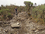 O último trecho do caminho é um passeio agradável, mas o primeiro é uma verdadeira prova de resistência e velocidade, no nosso caso ainda acentuda porque como demoramos para chegar ao cume, já partimos de lá atrasados (nossa equipe de carregadores ainda teria que desmontar nossas barracas no acampamento Barafu após um breve descanso nosso para então voltar a monta-lo no acampamento Mweka onde iríamos passar a última noite).