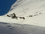 Depois de tirarmos algumas fotos na L’Alguille du Midi, começamos a caminhada rumo ao refúgio, onde chegamos por volta das 16h. Após um bom jantar, às 20h já estávamos devidamente instalados nos nossos confortáveis beliches, tentando descansar por algumas horas antes de partirmos para o que seria a nossa primeira tentativa de cume. Acordarmos às 00h50 da madrugada, tomamos um reforçado café-da-manhã, e à 01h50 saímos determinados a chegar no topo da Europa Ocidental. Até passarmos pelo primeiro dos três montes, o Mont Blanc du Tacul, íamos muito bem, caminhando em ritmo forte e constante. Entretanto, as condições da neve pioraram bastante após este ponto. A neve fofa e profunda nos fazia avançar muito lentamente e o risco de avalanche era eminente. A maioria dos grupos já havia decidido voltar e estávamos vendo o quanto estavam sofrendo os que ainda tentavam escalar a encosta inclinada do próximo monte, o Mont Maudit. Apesar de termos relutado e insistido ao máximo na possibilidade de continuar, não nos restou outra saída a não ser desistirmos também. Após avaliarmos friamente a situação, concluímos que não havia nada que pudéssemos fazer a não ser retornarmos ao refúgio, para descansarmos um pouco e tentarmos de novo no dia seguinte, torcendo para que as condições da neve estivessem melhores. Mesmo tendo a consciência de que essa era a decisão acertada, confesso que fiquei bastante frustrado, já que não via muitas possibilidades das condições da neve estarem diferentes no dia seguinte. De qualquer forma, não nos restou nada a fazer a não ser apreciarmos as belíssimas paisagens dos Alpes que nos acompanharam durante o caminho de volta.