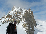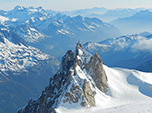 Depois de uma boa e longa noite de sono, saímos na metade manhã de Seyssins com destino a Chamonix. Por volta das 14h chegamos nessa linda e charmosa cidade situada aos pés do Mont Blanc. Almoçamos, tiramos algumas fotos e em seguida já tomamos o teleférico para L’Alguille du Midi, a 3.842m, desde onde teríamos que “desescalar” cerca de 200m até chegar no Refuge des Cosmiques (3.613m), local onde descansaríamos algumas horas, para em seguida partirmos para o ataque ao cume, a 1h30 da madrugada. A vista que se tem do maciço do Mont Blanc, quando se está na L’Alguille du Midi, é belíssima, realmente impressionante. Pela primeira vez, foi possível avistarmos claramente os famosos 3 montes, o Mont Blanc du Tacul (4.248m), o Mont Maudit (4.465m) e o finalmente o cobiçado cume arredondado do Mont Blanc, com seus 4.810m. Ao mesmo tempo em que estava maravilhado admirando a bonita paisagem, confesso que tive uma certa preocupação ao ver todo o trabalho que teríamos pela frente, até chegarmos ao cume.