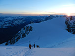 Depois de retornarmos para o refúgio e descansarmos durante algumas horas, é chegada a hora de tentarmos de novo. Saíamos às 02h00 da madrugada. No caminho fomos presenteados com um lindo nascer do sol atrás do Mont Blanc du Tacul.