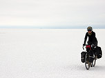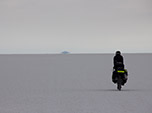 Mas pela manhã não estava tão mal como no sonho da noite anterior. O salar estava levemente alagado, fazia pocinhas salgadas por toda parte, e uma fina chuva caía. Enquanto tomamos nosso café da manhã a chuva parou e uma claridade ameaçou abrir um céu azul. Mas foi tudo enganação porque assim que estávamos prontos para pedalar, o céu se fechou outra vez, começou um vento frio nos empurrando nas costas como quem diz "Vai meu filho!", e seguimos um pouco emburrados pensando "Que droga, todas as fotos que vimos do salar eram de pessoas alegres pedalando sob um céu azul, sobre uma superfície lisamente branca, isso aqui não é nada como imaginamos!". A superfície era rugosa, como a de uma estrada de chão cheia de pedras salientes, estava frio, o céu era tão branco quanto o salar, só víamos uma fina linha acinzentada que dividia o firmamento da terra, o Vulcão Tununpa sumira de nosso horizonte, não sabíamos que ilha das que víamos era a que teríamos que mirar, não tínhamos nenhuma vontade de comemorar estarmos realizando nosso sonho, tínhamos um pouco de mau humor, causado sobretudo pela falta de energia feliz que nos traz o sol de cada manhã. Rezávamos para o tempo limpar. Ainda cedo pela manhã não víamos nenhum veículo. Seguíamos com dúvida naquela paisagem completamente branca, céu e terra pareciam ser uma coisa só, como um cenário de fundo inifinito por todos os lados, silêncio absoluto se não fosse pelo ruído de nossas bicicletas, uma sensação estranha, não estaríamos dentro do show de Truman?