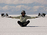 Na manhã seguinte frestas de azul celeste se mostravam como manchas esparsas no céu, fiquei imensamente feliz de finalmente ver alguma cor que não o branco acinzentado do dia anterior. Ficamos boa parte da manhã fazendo as mesmas poses patéticas, tal qual os turistas que vimos no dia anterior, centenas de fotos de perspectiva forçada até quase acabar a bateria da câmera, éramos crianças bobas e felizes. Pra completar nossa coletânea de fotos bobas, tiramos todas as roupas e pedalamos pelados por um pequeno trecho do deserto imenso. Mas assim que vimos um minúsculo veículo ao longe, começamos a nos vestir o mais rápido que pudemos, sentindo como se tivéssemos aprontando uma travessura. Poucas vezes na viagem nos divertimos e rimos tanto quanto nessa manhã, as mandíbulas doíam. Se alguém um dia por acidente ver estas fotos secretas vamos dizer que era porque precisávamos um pouco de vitamina D que havia faltado no dia anterior.